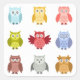 Adesivo de corujas vetoriais de cores diferentes em fila.