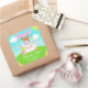 Este adesivo giro e caprichoso apresenta uma cabeleira vermelha com pele clara em um suporte de limonada cor-de-rosa que é decorado com flores e bunting. Ao fundo está um céu azul, sol e borboletas. O texto combina fontes decorativas e sans serif para um aspecto na moda e moderno. Isto é perfeito para uma festa de aniversário de verão. Gráficos de MUJKA