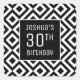 Legal adesivos de aniversário leem, "aniversário de 30 anos do NOME" em uma letra branca moderna em um quadrado preto com um padrão geométrico preto e branco moderno ao redor da fronteira. Personalize o nome e a idade (se necessário) na barra lateral para qualquer celebração de aniversário por ano. Os meandros negros se inclinam em torno de diamantes brancos contendo diamantes negros. Os ziguezags brancos proporcionam uma sutil separação entre os caminhos de enrolamento. Eles fazem selos de invólucro de excelente e embrulhos decorativos. Imagem criada digitalmente. Copyright ©Claire E. Skinner. Todos os direitos reservados.