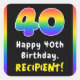 Este design de etiqueta de aniversário vibrante e divertida apresenta o número "40", tendo um espectro colorido do arco-íris inspirado em um padrão de gradiente, junto com a mensagem "Happy aniversário de 40 anos," e um nome de destinatário personalizado. Os autocolantes temáticos de aniversário otimistas como estes podem ser distribuídos ou usados numa festa de aniversário que comemora o quadragésimo aniversário de alguém, ou talvez usados na preparação de presentes ou convites para tal evento. [~Z0000630]