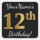 Este simples design de aniversário apresenta uma mensagem como "O 12 de Aniversário do Vosso Nome!", com o "12" a ter uma aparência falsa e imitada de cor inspirada em ouro, num fundo de cor preta. O nome pode ser personalizado. Os adesivos como estes poderiam talvez ser um presente para alguém que comemora o seu décimo segundo aniversário, ou talvez pudessem ser usados como decorações numa festa de aniversário. [~Z0000242]
