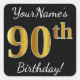 Este simples design de aniversário apresenta uma mensagem como "O 90 de Aniversário do Vosso Nome!", com o "90" a ter uma aparência falsa e imitada de cor inspirada em ouro, num fundo de cor preta. O nome pode ser personalizado. Os adesivos como estes poderiam talvez ser um presente para alguém que comemora o seu nonagésimo aniversário, ou talvez pudessem ser usados como decorações numa festa de aniversário. [~Z0000242]
