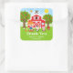 Este adesivo fofo e divertido apresenta uma menina de cabelo vermelho com pele clara ao lado de um celeiro vermelho com uma cata-vento de galo. Há adoráveis animais de fazenda, como uma vaca, porco e galinha. Ao fundo, há um céu azul brilhante, macieiras, sol, borboletas e margaridas. O texto combina fontes negrito e sem serifa para um visual moderno e elegante. Isso é perfeito para uma festa de aniversário com tema de fazenda.