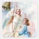 pintura em vintage de dois anjos com panos azuis e brancos segurando um fio de ouro e tocando um sino no céu.