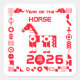 Design de cavalo vermelho geométrico a negros inspirado no zodíaco chinês e no simbolismo festivo.