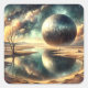 Uma esfera metálica massiva paira sobre uma paisagem reflexiva e estéril, criando uma cena esquisita, mas mesmerizadora. O céu está cheio de nuvens vibrantes e giratórias, lançando reflexões dramáticas na água abaixo.
