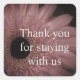 O arrendamento de casas e salas está a tornar-se cada vez mais competitivo. Separe seu aluguel de férias com este adesivo de apreciação barato. Uma bela fotografia floral cria uma rosa claro elegante e um pano de fundo preto sombrio para as suas palavras de apreciação em relação aos seus convidados. As palavras "obrigado você por ficar conosco" aparecem nas pétalas de flores e podem ser mudadas rápida e facilmente de acordo com suas necessidades.