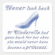 Nunca olhe para trás. Se Cinderela tivesse voltado para seu calçado, ela nunca teria se tornado uma princesa. Viva todos os dias ao máximo, e nunca olhe para trás; não importa o quão ruim alguma coisa possa aparecer, não há como dizer o que pode vir de bom. Você só vive uma vez, não perca tempo em arrependimentos! Uma design com escrevendo tipo vidro, e é claro, o escorregador de vidro da Cinderela.