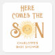 O adesivo de chá de fraldas deste menino bonitinho mostra o texto "Aqui Vem O Filho" em retrorreflectipografia com um sorridente sol de aquarela amarela. Facilmente personalizável. Porque nós criamos a nossa trabalho de arte, você não encontrará esta imagem exata de outros designers. Original Watercolor © Michele Davies.