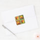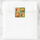 Quatro quadrados são decorados com folhas e abóboras em tons de outono de vermelho, laranja, amarelo e marrom. A costura branca adiciona um toque decorativo, dando ao padrão repetitivo a aparência de uma colcha, criando um sentimento perfeitamente aconchegante para o outono.