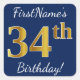 Este simples design de aniversário apresenta uma mensagem como "34º Aniversário do Primeiro Nome!", com o "34º" a ter uma aparência falsa e imitada de cor inspirada em ouro, num fundo de cor azul. O nome pode ser personalizado. Os adesivos como estes podem talvez ser um presente para alguém que comemora o seu trigésimo quarto aniversário, ou talvez possam ser usados como decorações numa festa de aniversário. [~Z0000248]