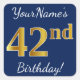 Este simples design de aniversário apresenta uma mensagem como "O 42º Aniversário do Seu Nome!", com o "42º" a ter uma aparência falsa e imitada de cor inspirada em ouro, num fundo de cor azul. O nome pode ser personalizado. Os adesivos como estes podem talvez ser um presente para alguém que comemora os seus quarenta segundos anos, ou talvez possam ser usados como decorações numa festa de aniversário. [~Z0000248]