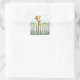 Uma girafa divertida espreitando sobre uma cerca branca de piquete com uma margarida na boca.