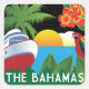 Memórias coloridas das Bahamas com autocolante de navio de cruzeiro são excelentes para o abate das reservas. A ilustração inclui um navio de cruzeiro, papagaio, palmeira, oceano e hibisco no estilo de ilustração da viagens vintage.