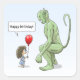 A garota diz feliz aniversário para sua amiga o grande goblin verde.