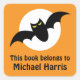 Um adesivo personalizado com um morcego preto com olhos amarelos brilhantes em frente a uma lua branca e cheio. Fundo laranja e texto branco personalizável "Este livro pertence a [Nome e Apelido]". Excelente para etiquetar os livros escolares dos seus filhos.