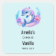 Velas, sabão, artesanato ou adesivos para produtos de cozinha com uma ilustração adorável. Um golfinho azul e roxo cercado por bonito florais submarinos coloridos.