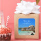 Festa a favor do obrigado que você cola com uma fotografia de uma praia azul-oceânica turquesa com grandes rochas espalhadas ao longo da costa. Local tropical brilhante e ensolarado.