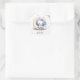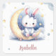 Um adesivo super bonito com um belo coelhinho branco vestindo um belo arco rosa sentado numa lua adorável com estrelas douradas caindo.