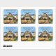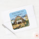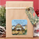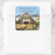 Adesivo Quadrado de 3" do Celeiro de Outono Evergreen/Colheita. Lindo celeiro histórico com vitrais seculares adornando a frente. Decorado para casamentos de outono e diversão de festa para amigos e familiares. Búfalo e iaque ao fundo. Use a mensagem existente ou personalize o cartão com sua própria mensagem e o nome da sua família ou empresa. "Bem-vindo ao Celeiro"!