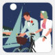 poster de viagens vintage para as Bermudas mostrando um casal elegantemente vestido em bicicletas por um porto iluminado pela lua.