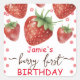 Trabalho de arte floral de cor de água de morango divertido. Morangos e florescem! Fonte de script doce. Tema de aniversário de morango doce rosa para crianças. É fácil personalizar. Também disponível como download digital! Primavera, festas de verão