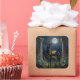 A black and gold Gazelle themed stickers. On the front is an illustration of a majestic gazelle with fur like molten black and gold, standing in ancient ruins bathed in ethereal moonlight. Intricate carvings adorn crumbling stone pillars, and bioluminescent flora casts a soft, otherworldly glow. The scene is rendered in a rich, textural oil painting style with thick impasto strokes.