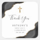 Este adesivo da Primeira Comunhão - você apresenta designs pretos de aquarela, corados com falso brilho dourado em dois cantos. Uma cruz de folha falsa de ouro aparece acima das palavras "Obrigado" em cinza de carvão escrita manual sobre fundo branco. Personalize-o com o nome do convidado de honra, a ocasião e a data em cartazes de cinza de carvão.