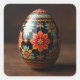An ornate black Easter egg with vibrant floral patterns adorned with intricate designs in shades of red, orange, yellow, and teal, with a prominent large red and yellow flower motif at its center. Smaller floral elements and decorative borders in similar colors encircle the egg, culminating in a patterned band around its top.