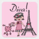 T-shirts, fatos de mergulho, canecas, bolsas, cartões, autocolantes, correntes-chave, travesseiros, relógios de parede, e muito mais, com uma design de diva fofa, com uma rapariga cabeleira negra num chapéu e um vestido cor-de-rosa, com o seu poodle rosa perto da Torre Eiffel!