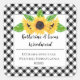 Um buquê rústico boho de girassóis encima seus nomes e endereço de devolução em um painel branco com bordas pretas acima de um fundo xadrez preto e branco de búfalo nesta alegre transição de verão para outono. Desenho composto por Holiday Hearts Designs (direitos reservados).