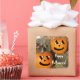 Duas abóboras engraçadas e bonitinhas de Halloween com olhos amarelos estão sentadas do lado de fora em degraus de madeira com folhas de outono.