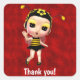 Um belo obrigado para crianças, que você coloca na cola com uma boneca de abelha doce (ou boneca de fada) vestida com uma fantasia de abelha preta e amarela, sobre um fundo de veludo vermelho. Ela está acenando e parece muito bonita de verdade. Este adesivo seria excelente para bolsas favoráveis na festa de aniversário de uma criança, ou você poderia personalizar o 'Obrigado' e mudá-lo para o nome de uma criança. O céu é o limite.