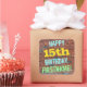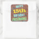 Este design de autocolante com tema de aniversário divertido apresenta uma mensagem como "FELIZ 15 BIRTHDAY, FIRSTNAME!", onde o nome pode ser personalizado. O fundo apresenta uma representação de uma parede de tijolos constituída por alguns tijolos de cor castanha avermelhada. O texto de mensagem personalizável apresenta cores como azul, amarelo e verde, e tem uma aparência inspirada pela do grafite pintado. Os adesivos como estes poderiam talvez ser dados como presente de aniversário, ou talvez usados como decorações numa festa de aniversário para alguém que comemora o seu décimo quinto aniversário. [~Z0000273]