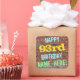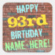 Este design de autocolante de aniversários divertido apresenta uma mensagem como "FELIZ 93º ANIVERSÁRIO, NOME AQUI!", onde o nome pode ser personalizado. O fundo apresenta uma representação de uma parede de tijolos constituída por alguns tijolos de cor castanha avermelhada. O texto de mensagem personalizável apresenta cores como azul, amarelo e verde, e tem uma aparência inspirada pela do grafite pintado. Os adesivos como estes poderiam talvez ser dados como presente de aniversário, ou talvez usados como decorações numa festa de aniversário para alguém que comemora o seu 93º aniversário. [~Z0000273]