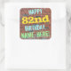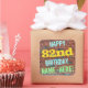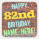 Este design de autocolante de aniversários divertido apresenta uma mensagem como "FELIZ 82º ANIVERSÁRIO, NOME AQUI!", onde o nome pode ser personalizado. O fundo apresenta uma representação de uma parede de tijolos constituída por alguns tijolos de cor castanha avermelhada. O texto de mensagem personalizável apresenta cores como azul, amarelo e verde, e tem uma aparência inspirada pela do grafite pintado. Os adesivos como estes poderiam talvez ser dados como presente de aniversário, ou talvez usados como decorações numa festa de aniversário para alguém que comemora o seu oitenta e segundo aniversário. [~Z0000273]
