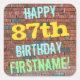 Este design de autocolante de aniversariante divertido apresenta uma mensagem como "FELIZ 87º ANIVERSÁRIO, NOME PRÓPRIO!", onde o nome pode ser personalizado. O fundo apresenta uma representação de uma parede de tijolos constituída por alguns tijolos de cor castanha avermelhada. O texto de mensagem personalizável apresenta cores como azul, amarelo e verde, e tem uma aparência inspirada pela do grafite pintado. Os adesivos como estes poderiam talvez ser dados como presente de aniversário, ou talvez usados como decorações numa festa de aniversário para alguém que comemora o seu oitenta e sétimo aniversário. [~Z0000273]