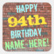Este design de autocolante de aniversariante divertido apresenta uma mensagem como "FELIZ 94º ANIVERSÁRIO, NOME AQUI!", onde o nome pode ser personalizado. O fundo apresenta uma representação de uma parede de tijolos constituída por alguns tijolos de cor castanha avermelhada. O texto de mensagem personalizável apresenta cores como azul, amarelo e verde, e tem uma aparência inspirada pela do grafite pintado. Os adesivos como estes poderiam talvez ser dados como presente de aniversário, ou talvez utilizados como decorações numa festa de aniversário para alguém que comemora o seu 90.º aniversário. [~Z0000273]
