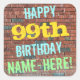 Este design de autocolante de aniversários divertido apresenta uma mensagem como "FELIZ 99º ANIVERSÁRIO, NOME AQUI!", onde o nome pode ser personalizado. O fundo apresenta uma representação de uma parede de tijolos constituída por alguns tijolos de cor castanha avermelhada. O texto de mensagem personalizável apresenta cores como azul, amarelo e verde, e tem uma aparência inspirada pela do grafite pintado. Os adesivos como estes poderiam talvez ser dados como presente de aniversário, ou talvez usados como decorações numa festa de aniversário para alguém que comemora o seu nono aniversário. [~Z0000273]