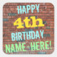 Este design de autocolante de aniversariante divertido apresenta uma mensagem como "FELIZ 4º ANIVERSÁRIO, NOME AQUI!", onde o nome pode ser personalizado. O fundo apresenta uma representação de uma parede de tijolos constituída por alguns tijolos de cor castanha avermelhada. O texto de mensagem personalizável apresenta cores como azul, amarelo e verde, e tem uma aparência inspirada pela do grafite pintado. Os adesivos como estes poderiam talvez ser dados como presente de aniversário, ou talvez usados como decorações numa festa de aniversário para alguém que comemora o seu quarto aniversário. [~Z0000273]