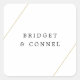 Autocolantes de casamento simples e modernos com duas linhas de ouro falsas, uma na parte superior esquerda e uma na parte inferior direita, sobre um fundo branco. No meio estão seus nomes. Um na moda e design mínimo que é excelente para o casal minimalista. Estes adesivos são perfeitos para selar seus envelopes.