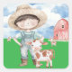 Button mit einem Jungen mit seinem kleinen Kalb auf einer grünen Wiese mit einer roten Scheune im Hintergrund.