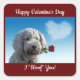 Uma foto adorável de um pãozinho bonitinho segurando um rosa na boca, é mostrada neste adesivo quadrado. O Sticker diz, "Feliz dia de os namorados e eu "Woof" You"! Um doce adesivo para enviar aquela correspondência especial, ou decoração e reserva de sucata. Este design também está disponível como uma placa de saudação de Namorados!