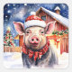 Um porquinho de Natal bonito tinha autocolantes com uma coloração d'água em pé na frente de um celeiro em um dia de inverno nevado.