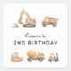Um adesivo de festa moderno com caminhões de construção em aquarela e tipografia preta em negrito. Perfeito para selar envelopes, sacolas de brindes ou decorações de festa.