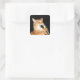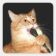 Gato de mesa laranja agarra o microfone e canta, ou canta, seu autocolante fotográfico quadrado