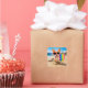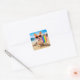 Esta foto fofa mostra um cão chihuahua na praia carregando uma bandeira Orgulho gay de cor arco-íris.