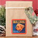 Um impressão de etiqueta de caixa de safra ilustrando um buldogue com um fundo azul padronizado e uma borda laranja. Escolha este impressão de arte no seu produto Zazzle hoje mesmo.