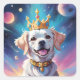 Uma arte captivante gerada por IA combinando elementos cósmicos com um cão vestindo uma coroa no espaço.
