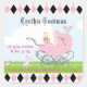 Uma menina nova e fofa apresentando um bebê em uma carruagem de bebê rosa-vintage em um gramado, manchada com pássaros cor-de-rosa e coelho rosa, contra um céu azul pastel com nuvens brancas indefinidas. O nome da criança encontra-se no centro de topo em letras decorativas muito grandes e, por baixo e por baixo, em letras cor-de-rosa, é a data de nascimento e a hora de nascimento, o comprimento e o peso da criança. Uma manutenção perfeita para a nova menina. Tudo isso em um fundo de argilo (diamante) rosa, preto e branco. Uma ideia de presente de excelente para novos pais.